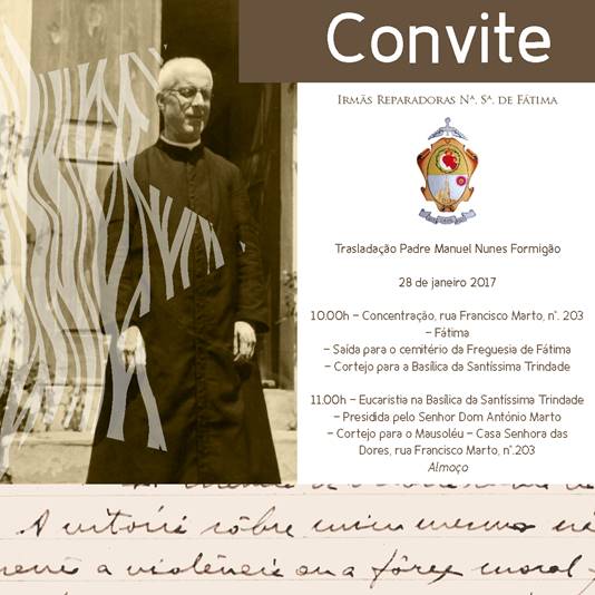 As Irmãs Reparadoras de Nossa Senhora de Fátima anunciam que a transladação dos restos mortais do P. Manuel Nunes Formigão vai fazer-se a 28 de Janeiro de 2017 do Cemitério de Fátima para o Mausoléu na Casa Senhora das Dores.